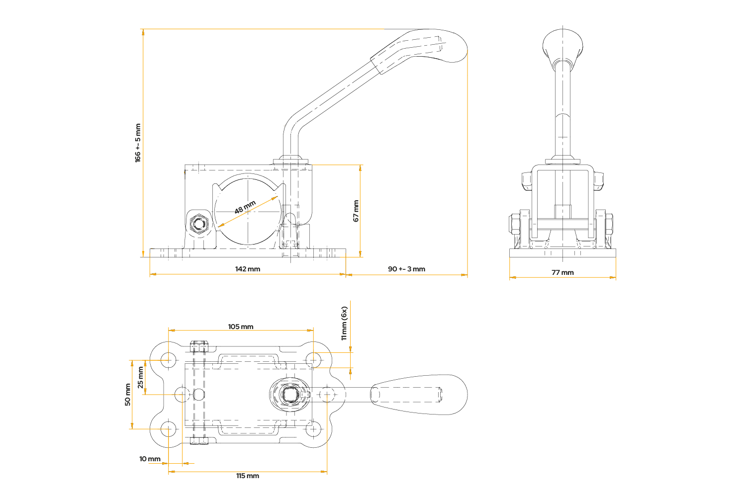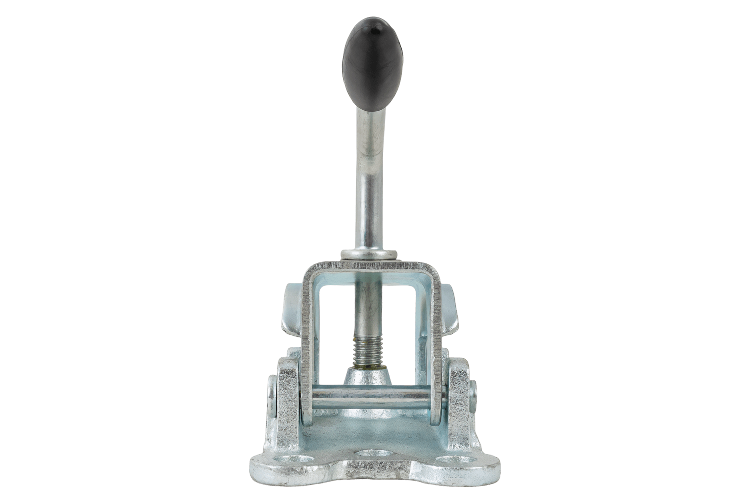 Το συμπαγές χυτό αμάξωμα είναι εξαιρετικά άκαμπτο και ανθεκτικό στα φορτία κατά τους ελιγμούς του ρυμουλκούμενου. Η ηλεκτρογαλβανισμένη επιμετάλλωση ψευδαργύρου προστατεύει το στοιχείο από τη διάβρωση σε τυπικές συνθήκες λειτουργίας (βροχή, λάσπη, αλάτι δρόμου), διασφαλίζοντας ότι ο σφιγκτήρας διατηρεί τη λειτουργικότητα και την αισθητική του για μεγάλο χρονικό διάστημα. Ο εργονομικός μοχλός επιτρέπει την εύκολη σύσφιξη και απασφάλιση με το ένα χέρι.