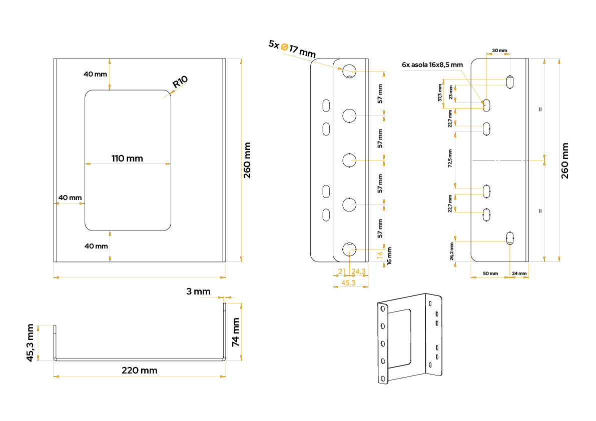 Οι βάσεις είναι κατασκευασμένες από χάλυβα ψυχρής γαλβανισμού πάχους 3 mm , εξασφαλίζοντας υψηλή αντοχή στη διάβρωση και ανθεκτικότητα σε οδικές συνθήκες. Το κιτ σάς επιτρέπει να στερεώσετε με ασφάλεια το κουτί στο πλαίσιο ή τη δομή του οχήματος, περιορίζοντας την κίνησή του κατά την οδήγηση.