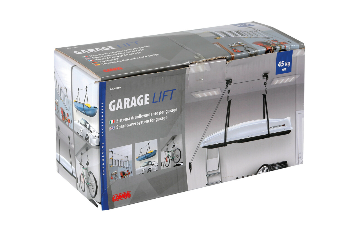 Το σύστημα είναι εύκολο στην εγκατάσταση— οι βάσεις μπορούν να στερεωθούν απευθείας στα δοκάρια ή στην οροφή και στη συσκευασία περιλαμβάνεται ένα πλήρες κιτ τοποθέτησης . Το Garage Lift είναι μια λειτουργική προσθήκη που εξοικονομεί χώρο σε οποιοδήποτε γκαράζ, εργαστήριο ή βοηθητικό δωμάτιο.