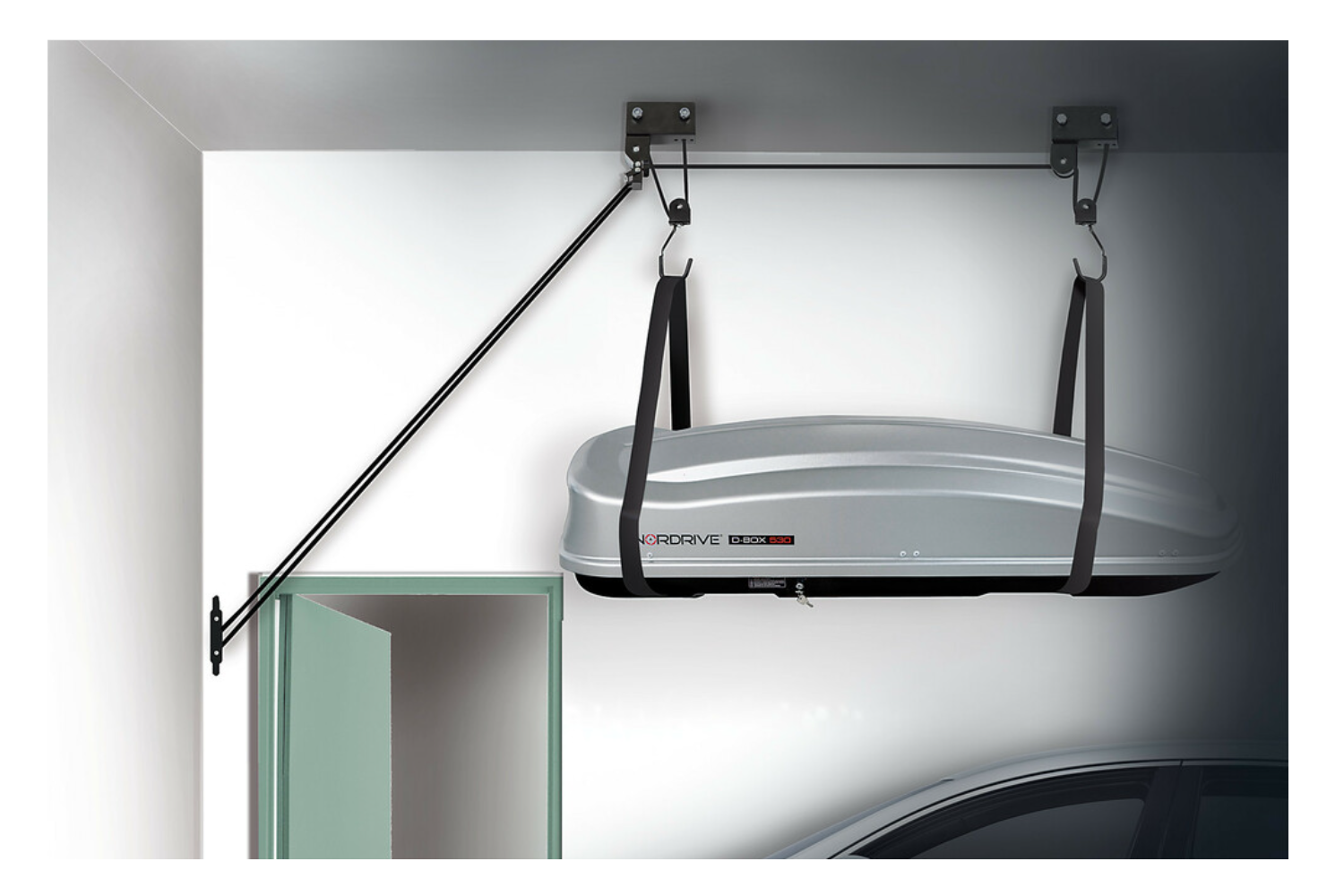 Η συσκευή είναι ιδανική για την αποθήκευση μπαγκαζιέρων οροφής, καγιάκ, κανό, ποδηλάτων και σκαλών βάρους έως 45 κιλών . Βοηθά στην οργάνωση των πραγμάτων, προστατεύει τον εξοπλισμό από ζημιές και επιτρέπει γρήγορη πρόσβαση όταν χρειάζεται.