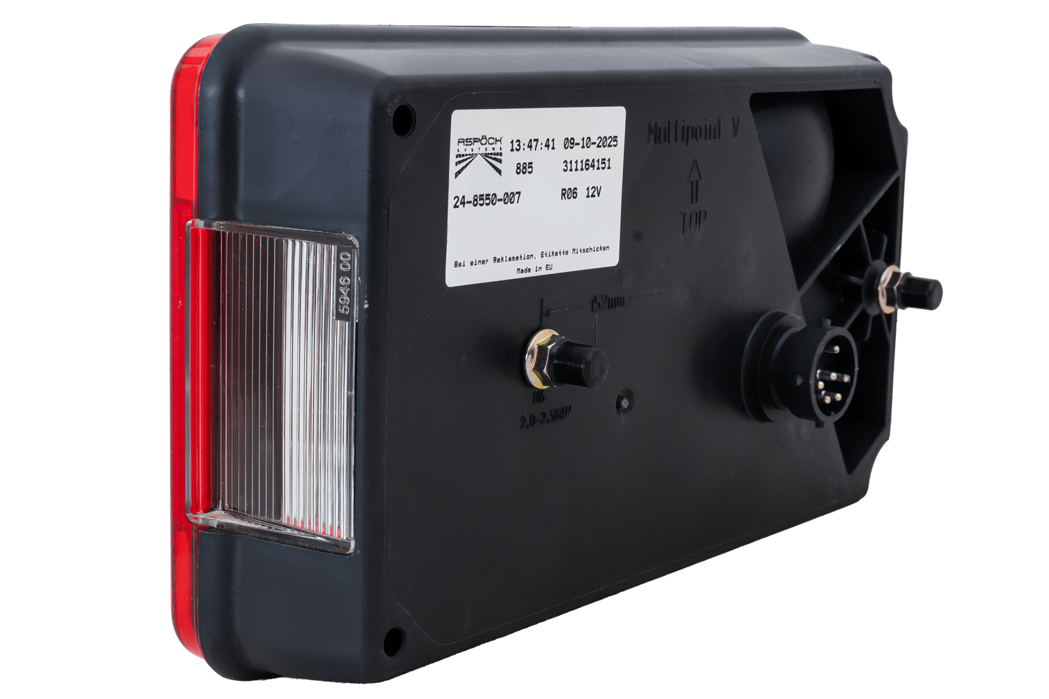 Ένα σετ δύο πίσω φώτων MULTIPOINT V της ASPÖCK , που προορίζονται για εγκατάσταση στην αριστερή και τη δεξιά πλευρά του οχήματος , χαρακτηρίζονται από τις ακόλουθες διαστάσεις: πλάτος 238 mm, ύψος 140 mm, βάθος 55 mm . Και οι δύο λάμπες είναι εξοπλισμένες με υποδοχές μπαγιονέτ 8 ακίδων , οι οποίες επιτρέπουν γρήγορη και εύκολη εγκατάσταση. σε ρυμουλκούμενα, λεωφορεία ή ρυμουλκούμενα .
