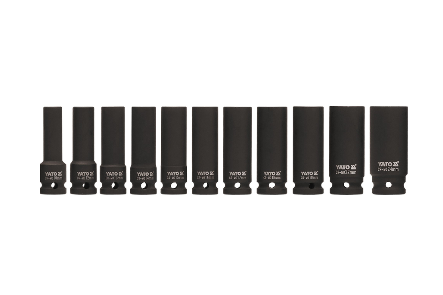 Το σετ μακριών καρυδάκια κρούσης YT-1054 της YATO περιλαμβάνει 11 ανθεκτικά καρυδάκια 1/2" κατασκευασμένα από χάλυβα CrMo SCM-440 εξαιρετικά ανθεκτικό σε φορτία. Αυτά τα μακριά καρυδάκια, ύψους περίπου 78 mm , είναι ιδανικά για δυσπρόσιτα σημεία. Το εξαγωνικό προφίλ και το σύστημα AS-DRIVE εξασφαλίζουν αξιόπιστη μεταφορά ροπής χωρίς τον κίνδυνο πρόκλησης ζημιάς στα παξιμάδια, ενώ ο εκτεταμένος σχεδιασμός διευκολύνει την εργασία σε δυσπρόσιτα σημεία.