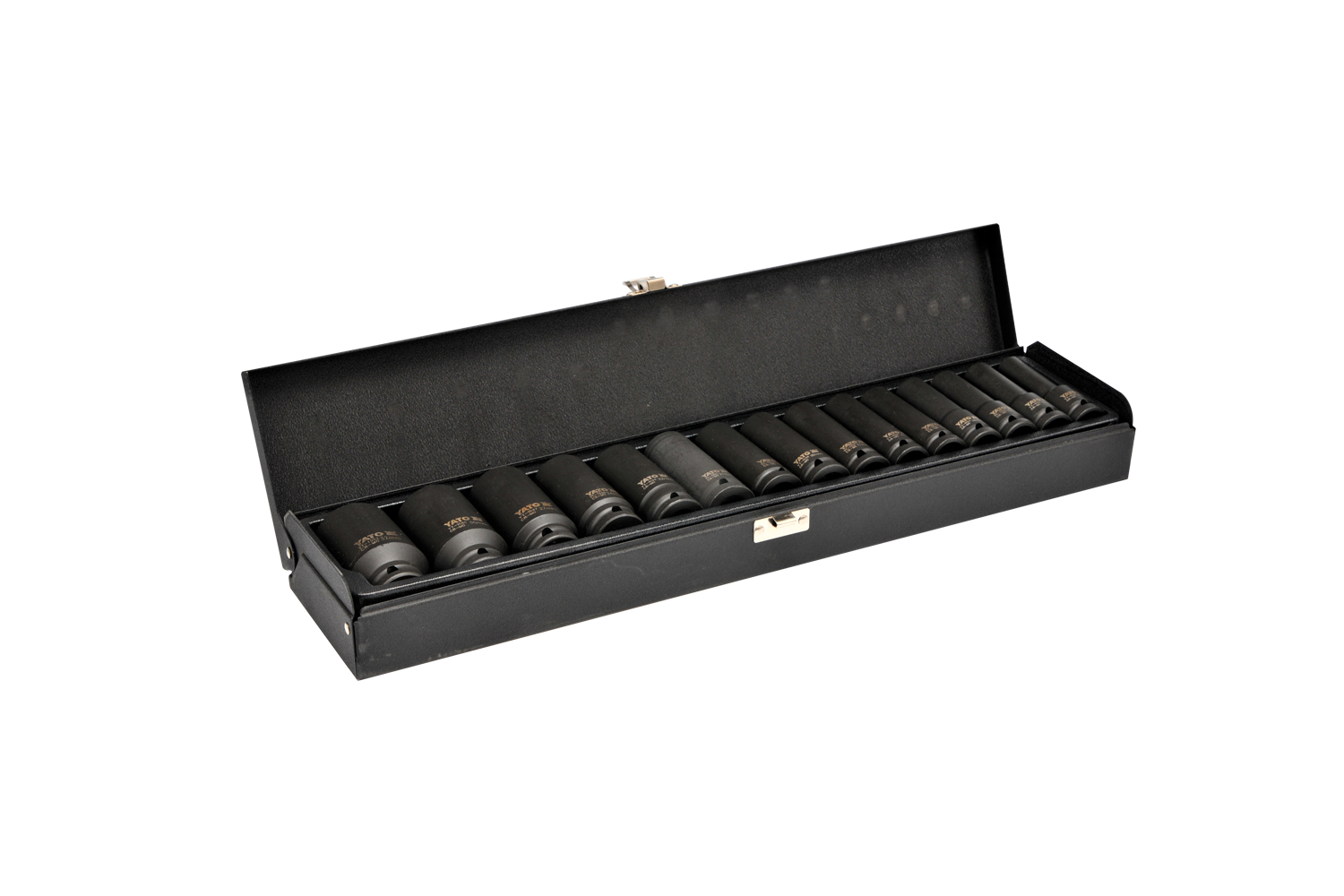 Το σετ μακριών καρυδάκια κρούσης YT-1055 της YATO περιλαμβάνει 15 ανθεκτικά καρυδάκια 1/2" κατασκευασμένα από χάλυβα SCM-440 CrMo εξαιρετικά ανθεκτικό σε φορτία. Αυτά τα μακριά καρυδάκια, ύψους περίπου 78 mm , είναι ιδανικά για δυσπρόσιτα σημεία. Το εξαγωνικό προφίλ και το σύστημα AS-DRIVE εξασφαλίζουν αξιόπιστη μεταφορά ροπής χωρίς τον κίνδυνο πρόκλησης ζημιάς στα παξιμάδια, ενώ ο εκτεταμένος σχεδιασμός διευκολύνει την εργασία σε δυσπρόσιτα σημεία.