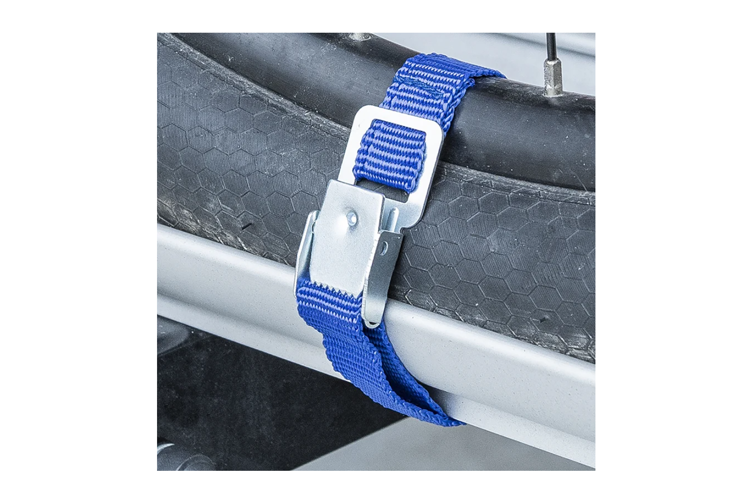 Ιμάντες Στήριξης Βάσης Ποδηλάτου με Αυτοασφαλιζόμενη Μεταλλική Αγκράφα – 4 τεμάχια. Αυτό το πρακτικό σετ έχει σχεδιαστεί για την ασφαλή στερέωση των τροχών ποδηλάτου στις σχάρες αυτοκινήτου. Οι ιμάντες συγκρατούν με ασφάλεια τους τροχούς στις ράγες της σχάρας, εμποδίζοντάς τους να μετακινηθούν κατά την οδήγηση. Η στιβαρή κατασκευή και η ανθεκτική μεταλλική κλειδαριά εξασφαλίζουν ασφαλή και σταθερή τοποθέτηση του ποδηλάτου κατά τη μεταφορά.