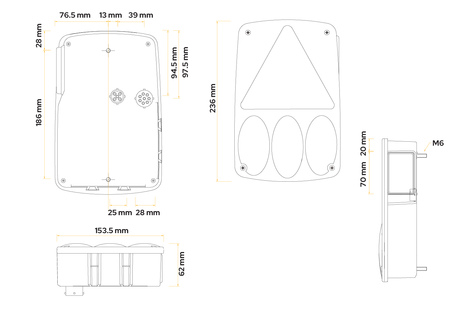 Το πίσω φωτιστικό Earpoint IV της ASPÖCK προορίζεται για εγκατάσταση στην αριστερή πλευρά του οχήματος και έχει τις ακόλουθες διαστάσεις: πλάτος 153,5 mm, ύψος 236 mm, βάθος 62 mm . Εξοπλισμένο με βύσματα μπαγιονέτ 5 και 8 ακίδων , επιτρέπει την εύκολη και γρήγορη εγκατάσταση σε ρυμουλκούμενα, λεωφορεία και ρυμουλκούμενα .