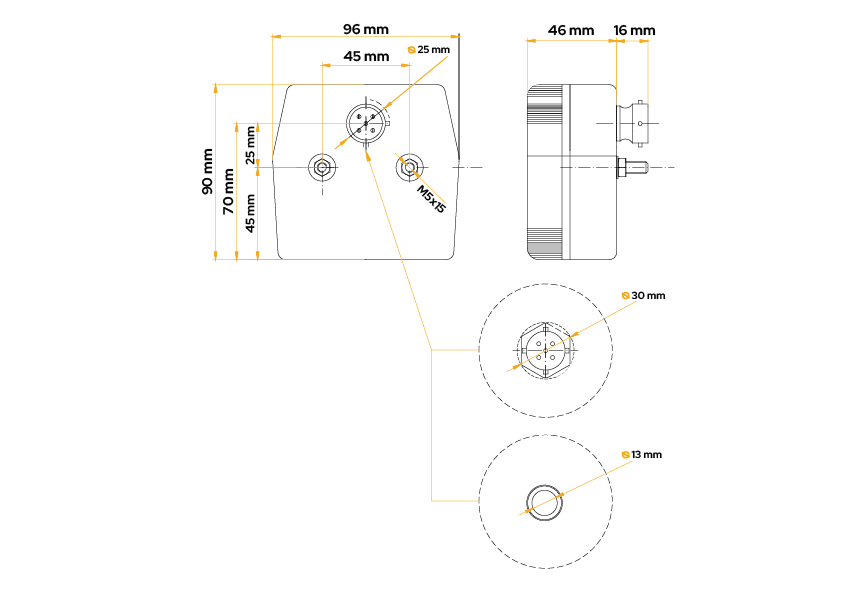 Το πίσω φωτιστικό MD-002 της FRISTOM είναι σχεδιασμένο για τοποθέτηση στην αριστερή και δεξιά πλευρά του οχήματος και χαρακτηρίζεται από τις ακόλουθες διαστάσεις: πλάτος 96 mm, ύψος 90 mm, βάθος 46 mm . Υπάρχει ένας ελαστικός δακτύλιος στο πίσω μέρος του λαμπτήρα που διευκολύνει τη σύνδεση του καλωδίου, καθιστώντας το ιδανικό για χρήση σε ρυμουλκούμενα και φορτηγά .