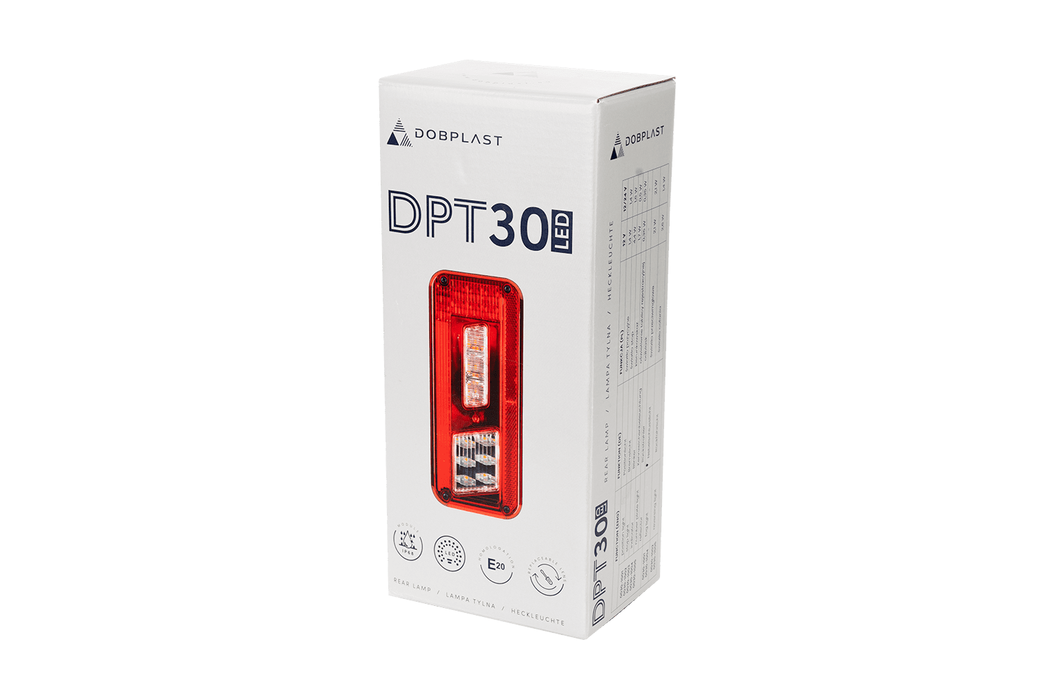 Το πίσω φως LED DPT30 της DOBPLAST, σχεδιασμένο για τοποθέτηση στην αριστερή πλευρά του οχήματος , έχει πλάτος 218 mm , ύψος 98 mm και βάθος 57 mm . Σχεδιασμένο για λειτουργία 12V , είναι κατάλληλο για χρήση σε ελαφρά ρυμουλκούμενα, φορτηγά και τρέιλερ, ενισχύοντας περαιτέρω την ευελιξία του . Εξοπλισμένο με υποδοχή μπαγιονέτ 5 ακίδων , επιτρέπει γρήγορη και εύκολη εγκατάσταση. Χάρη στην τεχνολογία LED, το φως παρέχει υψηλή απόδοση, ανθεκτικότητα και ενεργειακή απόδοση, εξασφαλίζοντας ασφάλεια σε μια ποικιλία οδικών συνθηκών. Το φως διαθέτει αντικαταστάσιμες, αδιάβροχες μονάδες LED.