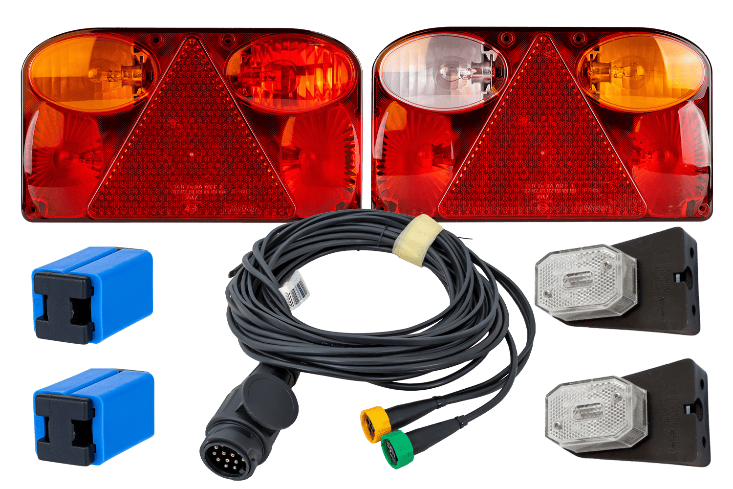 Το κιτ φωτισμού είναι μια ολοκληρωμένη ηλεκτρική εγκατάσταση που παρέχει πλήρη και συμβατό με τους κανονισμούς φωτισμό για ρυμουλκούμενα, ρυμουλκούμενα και άλλα οχήματα μεταφοράς , αυξάνοντας την ορατότητα και την ασφάλειά τους στο δρόμο. Αποτελείται από πίσω φώτα, πλευρικά φώτα σήμανσης, ηλεκτρική πλεξούδα και ταχυσύνδεσμους. Οι γρήγορες υποδοχές επιτρέπουν τη γρήγορη και εύκολη εγκατάσταση και εξασφαλίζουν μια ανθεκτική και ασφαλή σύνδεση των φώτων σήμανσης με τα καλώδια. Χάρη στα εξαρτήματα υψηλής ποιότητας, το σετ εγγυάται αξιόπιστη λειτουργία και καλή ορατότητα. και συμμόρφωση με τα ισχύοντα πρότυπα ασφαλείας. Αυτή είναι η τέλεια λύση για όσους αναζητούν ένα ολοκληρωμένο και ανθεκτικό σύστημα φωτισμού οχημάτων .