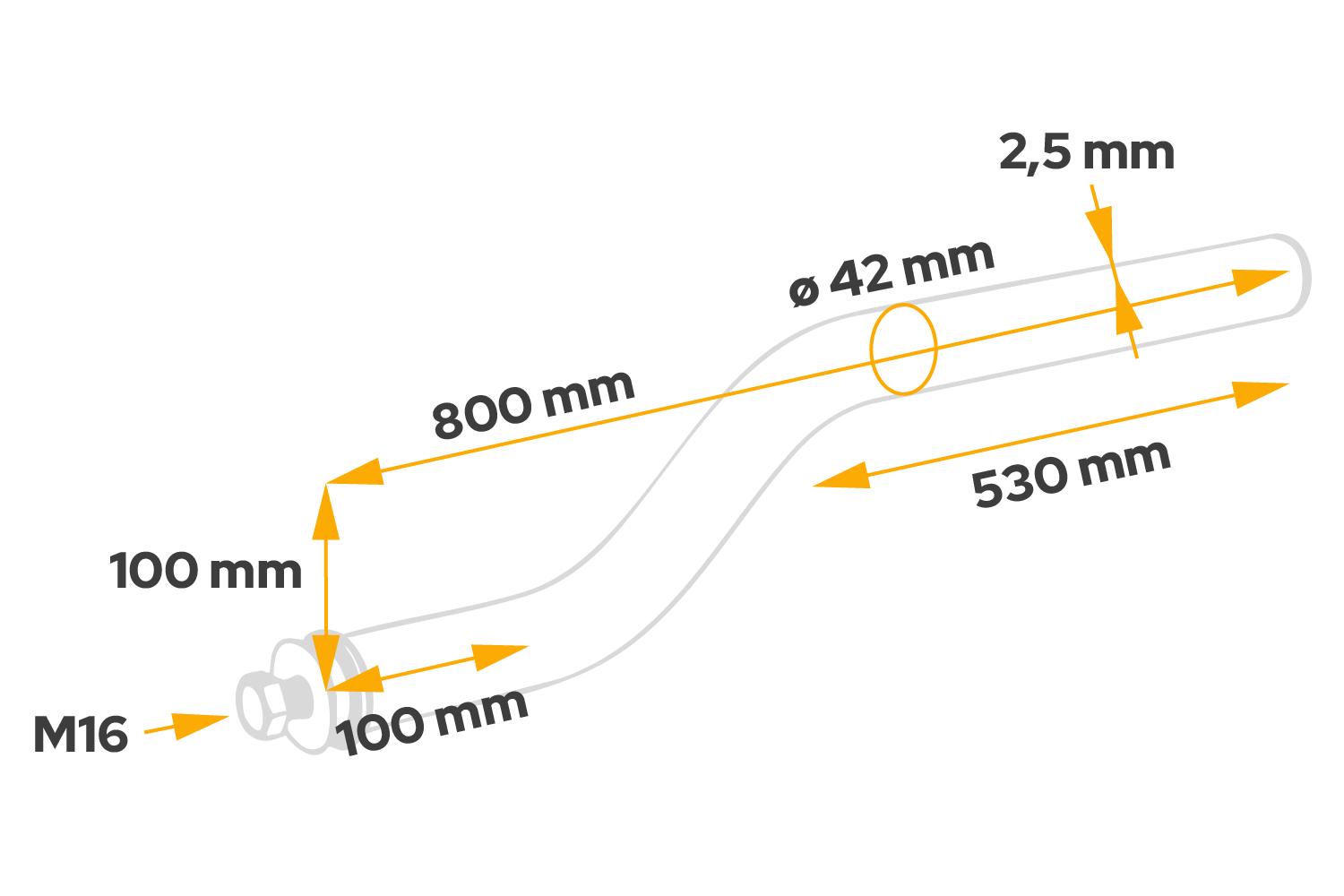 Ο καμπυλωτός σωλήνας DK8026 της DOMAR είναι ένα στιβαρό στοιχείο στήριξης κατασκευασμένο από χάλυβα, με μαύρη ηλεκτροστατική βαφή, γεγονός που αυξάνει την αντοχή του στη διάβρωση και στις σκληρές συνθήκες λειτουργίας. Ο σωλήνας έχει διάμετρο 42 mm , μήκος 800 mm και εξωτερικό σπείρωμα M16 , επιτρέποντας γρήγορη και ασφαλή εγκατάσταση με άλλα συνδετικά στοιχεία, όπως σφιγκτήρες ή βραχίονες.
