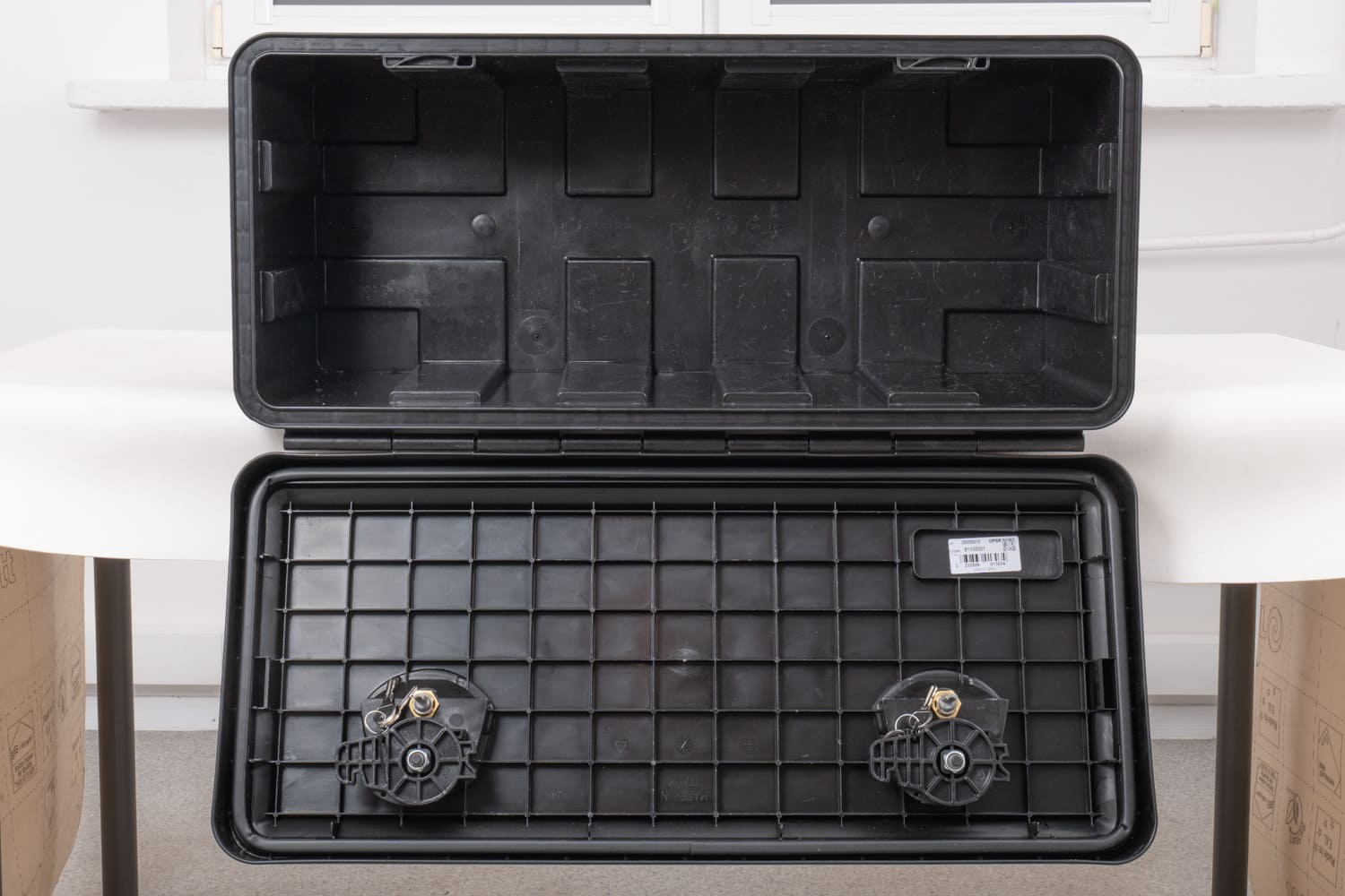 Το κουτί είναι κατασκευασμένο από πολυπροπυλένιο και νάιλον υψηλής ποιότητας, επιπλέον ενισχυμένο με νευρώσεις, γεγονός που αυξάνει την ανθεκτικότητα και την αντοχή του σε μηχανικές βλάβες. Το υλικό παρέχει εξαιρετική προστασία από φωτιά, νερό, σκόνη, καύσιμο, ακτίνες UV και ακραίες θερμοκρασίες , καθιστώντας το ιδανική λύση για εντατική χρήση σε δύσκολες συνθήκες. Το κάλυμμα του κουτιού είναι εξοπλισμένο με ελαστική σφράγιση που εξασφαλίζει πλήρη στεγανότητα, εμποδίζοντας την είσοδο νερού και σκόνης στο εσωτερικό . Αυτός ο σχεδιασμός προστατεύει αποτελεσματικά τα αποθηκευμένα εργαλεία και τον εξοπλισμό από επιβλαβείς εξωτερικούς παράγοντες, κάτι που είναι ιδιαίτερα σημαντικό σε περίπτωση εντατικής χρήσης σε εργοτάξια ή σε δύσκολες καιρικές συνθήκες.